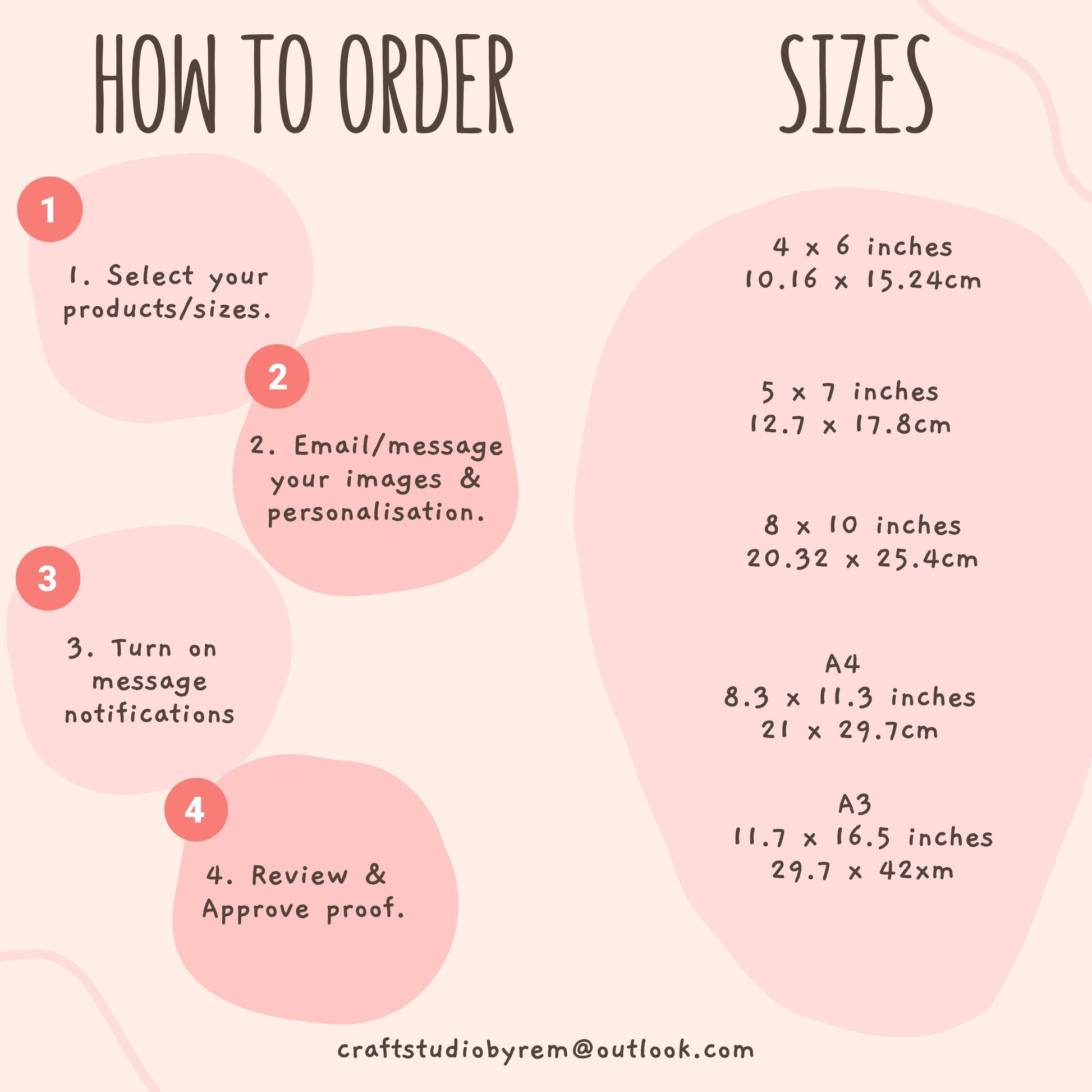Once images have been received to either craftstudiobyrem@outlook.com or the message thread a proof will be sent over for you to review and make any changes. Your order will then be made and sent via Royal Mail tracked 48!